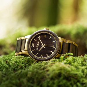 The Prosper features a stainless steel case with a stunning gold polish. A deep black sandalwood around the bezel and dial face compliments the brilliant metal finish resulting in a watch that exudes class. Roman numerals stand proud in a sapphire coated crystal glass, held together by a metal and ebony wood link band to complete the package. With each hand picked grain of wood being unique, the Prosper is perfect for the wearer who wants to set themselves apart from the crowd.